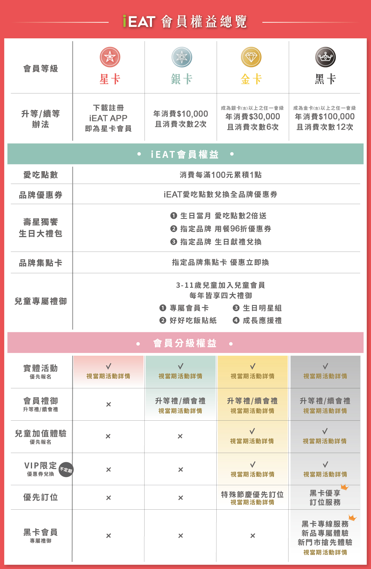 - 兒童會員:限定級別之iEAT會員或累積消費金額達指定門檻,即可申請綁定兒童會員,1位iEAT會員至多綁定3位兒童會員。申辦加入兒童會員,每年皆享四大「兒童專屬禮御」;不定期舉辦「兒童加值體驗」活動,金卡、黑卡會員綁定之兒童會員可優先報名。